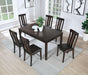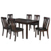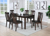 The streamlined Boller seven piece table and chair set is a great way to update a casual dining room or kitchen. Small apartment or condo dining space, no problem, elongated dining sets like this are perfect for rooms where floor space is hard to come by and create a more open, airy look. Contemporary rectangle dining table is ideal for entertaining because it allows easy conversation for all. If you have young children, counter height stools are still easy to get in and out of with stretchers to step on and give you a place to rest your feet while relaxing on the comfortable padded faux leather seats. Enjoy gathering around this burnished brown wood rectangular table and chair set to eat a cozy meal, play a game with family and party with friends.