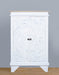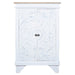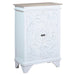 Bohemian style with art deco display, this solid Mahogany wood distressed true white entryway cabinet will brighten your day! Apartment and condo sized space-saving tall and slim console features intricately carved panel doors that open to reveal two levels of storage space. Perfect for your bathroom, dining room, kitchen, bedroom, foyer, and hall, wherever you have items to store. Inside is the same finish as the distressed driftwood brown top to coordinate with your French countryside, cottage chic, or modern farmhouse home.