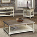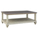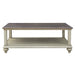 Farmhouse charm with an island vibe, this light and breezy coffee table will add coastal living style to your lake house, country cottage or high rise. Antique white finish will brighten your living room while the walnut top will blend with your traditional decor. Convenient shelf for storage of games, display decorative accents or keep blankets handy on a cool cozy night. Authentic wood planks and bun feet ground this living room table with contemporary style. Like the surf hitting the sand, have one room flow into the other, create a curated look with matching bedroom collection.
