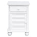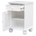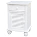 Quality is in the detail and just a click away to bring luxury resort beach house style home and enjoy every day. Fresh crisp contemporary white invigorates your mornings and at night, soft subtle lighting will enhance the splendor of this transitional nightstand to accessorize your master suite, kids room, nursery or living room. This narrow side table with universal appeal will lighten the vibe in any room, felt lined drawer rolls out on heavy duty metal glides to provide ample storage. Individual fixed open shutters on the cabinet door add an easy breezy touch. Sunset Trading White Shutter Wood configurable furniture collection offers louvered panel beds, armoire, chest, double dresser, mirror, tall pantry cabinet, room divider and wide nightstand available separately to make all your coastal living home decorating ideas come to life.