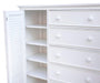 Quality is in the detail and just a click away to bring luxury resort beach house style home and enjoy every day. Fresh crisp contemporary white invigorates your mornings and at night, soft subtle lighting will enhance the splendor of this transitional gentleman’s chest to accessorize your master bathroom or bedroom, turn your flex room into a bonus guest bedroom or storage for your home school room. This oversized bedroom chest with universal appeal will lighten the vibe in any room, drawers roll out on heavy duty metal glides with felt lined top drawer for you finer possessions. Individual fixed open shutters on the cabinet doors add an easy breezy touch and reveal so much storage you will be amazed. Sunset Trading White Shutter Wood configurable furniture collection offers louvered panel beds, chest of drawers, double dresser, mirror, tall pantry cabinet, room divider and two size nightstands available separately to make all your coastal living home decorating ideas come to life.
